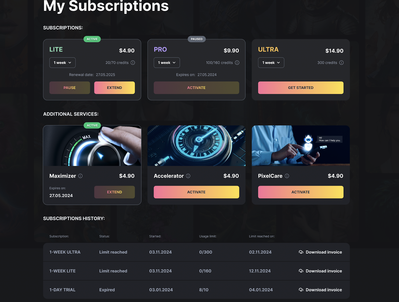If you have an active subscription, you will be charged automatically according to the billing cycle of your chosen plan. To check the status of the subscription: